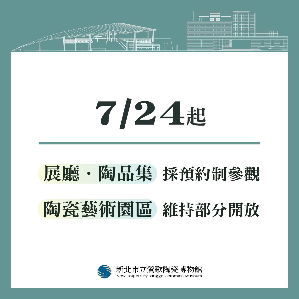 ✅開放預約參觀空間為:各樓層展廳、禮品店。 🚫餐廳、國際演講廳、陶藝研習室、兒童體驗室,持續暫停服務(含作品取件)。 ✅戶外陶瓷藝術園區、收費停車場,部分開放。 🕒開放時間:每日9:30-17:00 🚫小陶窩、戲水池、沙坑,持續關閉。 ✅民眾進入本館場域,請全程佩戴口罩、量額溫、「實名制」登記。並保持社交距離,避免群聚。 🚫額溫逾37.5度者禁止進入。